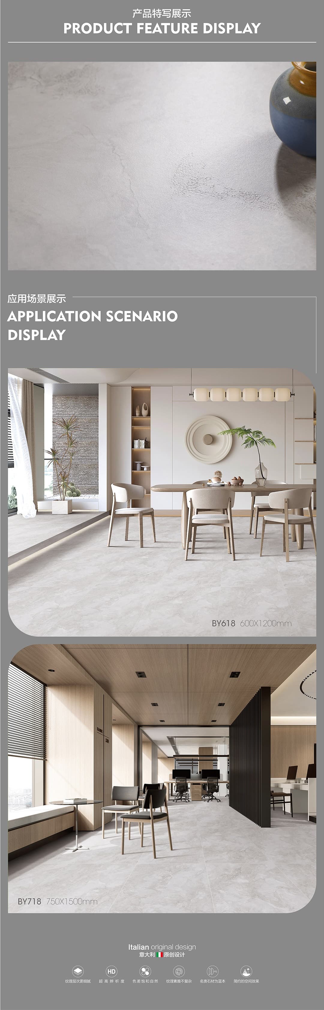 產(chǎn)品特性 表面柔和,防污效果強(qiáng),防滑R10指標(biāo)高,抗折強(qiáng)度好
